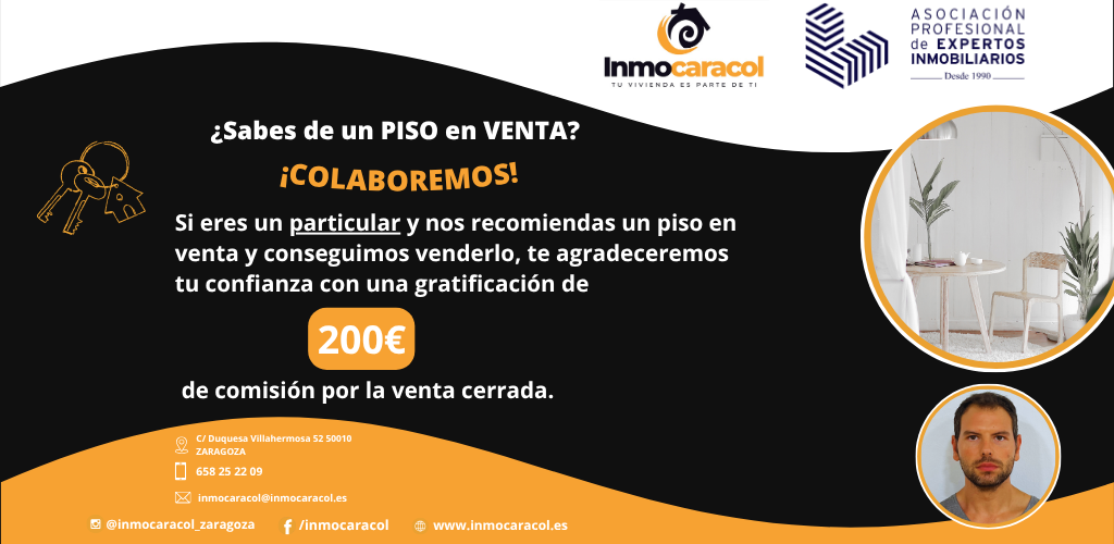 La propuesta es muy sencilla: por cada piso que me recomiendes y que logremos vender a través de Inmocaracol, recibirás una gratificación de 200 euros como muestra de agradecimiento por tu apoyo.